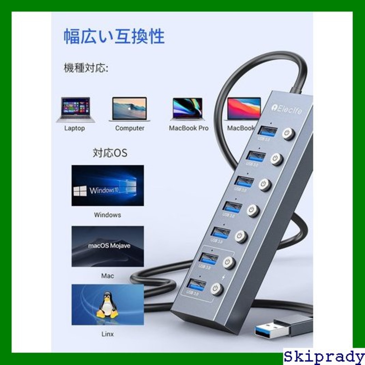 【本日限定価格】 Elecife アルミニウム 電源付き ACアダプタ付 5V/3A 独立スイッチ付 セルフパワー/バスパワー コンパクト USB拡張 5Gbps高速 7ポート Hub 3.0 ハブ USB 32 | Skiprady MENS
