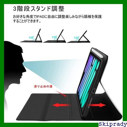 【多角度調整なスタンド機能】・・・ iPad mini第6世代 ケースは、人間工学に基づいて底部は三つ滑り止めのスタンド機能を搭載し、お好きな角度を調整できます。タイピングや動画視聴などiPadを立ててご使用の際に、安定したスタンド機能をご利用いただけます。長い間頭を下げてキーボードとiPadを使って、頚椎の負担を避けることができます。