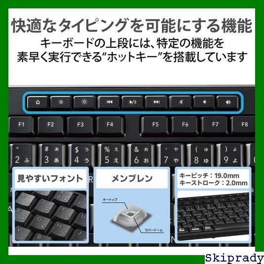 サイズ:コンパクト(テンキーレス) 【 仕様 】■ インターフェイス:USB■ コネクタ形状:USB(A)オス■ 対応機種:USBポートを装備したWindows OS、macOS、Chrome OS搭載機■ 対応OS:Windows 10、Windows 8.1、 macOS Big sur (11)、 Chrome OS ※各OSの最新バージョンへのアップデートや、サービスパックのインストールが必要になる場合があります。※最新情報は対応表をご確認ください。■ カラー:ブラック■ キータイプ:メンブレン■ キー配列:92キー+9キー(日本語配列)■ キーピッチ:19mm■ キーストローク:2mm■ ホットキー数:9キー■ 電源方式:USBバスパワー■ ケーブル長:1.5m■ 外形寸法:幅361.6mm×奥行139.8mm×高さ26.3mm(スタンド含まず)、幅361.6mm×奥行139.8mm×高さ34.8mm(スタンド時)■ サイズ分類:コンパクト■ 質量:約360g ※ケーブル含む■ VCCI classB対応:○■ 期間:【 説明 】■ 音が気になる場所や時間帯での使用に最適な有線タイプの静音コンパクトキーボードです。デスク周りのスペースを有効に使えるテンキーレスタイプです。■ 各キートップに装着したシリコンラバーによって打鍵音を大幅に軽減。公共施設や会議室、夜中や朝方など音が気になる場所や時間帯での使用に最適です。■ 独自のファームウェアを搭載することにより、Windows、Chrome OS、macOSで使用可能です。■ 誤って水などの液体をキーボード上にこぼしても、本体裏面の水抜き穴からすぐに液体を排出できる排水機構を搭載しています。(防水設計ではありません)■ 抗菌加工によって、菌の繁殖を抑え、清潔に保ちます。(抗菌範囲:キーボード筐体、印刷部分) ※※ こちらの製品は表面上における細菌の増殖を抑制、あるいは阻害する性能を有したもので、財団法人日本規格協会(JSA)が定める抗菌性試験に準拠したものです。■ キーボードの上段には、特定の機能を素早く実行できるホットキーを搭載しています。専用キーを押すだけでメディアプレーヤーの起動、音量や明るさの調整など、9種類の操作が可能です。■ キートップをラバードームで支えるメンブレン方式を採用しています。■ キートップにはスタイリッシュで見やすいオリジナルフォントを使用しています。■ 大型のエンターキーや、独立して配置されたDelete、Insertなどの特殊キーにより、誤入力しにくく快適なキータイピングが行えます。また、打鍵しやすいキーピッチ19mmで快適なタイピングが可能です。■ 姿勢に合わせて傾斜角を2段階で調整できる角度調整スタンド付き。また、スタンドにはしっかりしたキータッチに役立つすべり止めが付いています。■ 専用ドライバなどのインストールは不要で、パソコンのUSBポートにコネクターを接続するだけですぐに使用可能です。また、パソコンから給電するため電池交換も不要です。■ 紙と最小限の環境配慮プラスチックを使用した環境にやさしいパッケージを採用しています。また、ユーザーズマニュアルをオンライン化し、紙の使用量削減にも取り組んでいます。【商品に関するお問い合わせ】エレコム総合インフォメーションセンターTEL. 0570-084-465FAX. 0570-050-012受付時間 / 10:00~19:00 年中無休