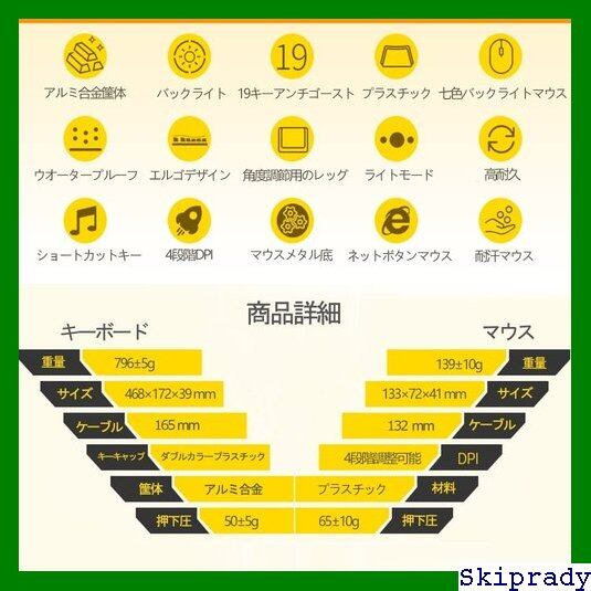 FN+F1 音楽プレイヤー FN+F2 音量- FN+F3 音量+ FN+F4 静音 FN+F5 メディア OFF FN+F6 前のトラック FN+F7 再生/一時停止 FN+F8 次のトラック FN+F9 メール FN+F10 ホーム FN+F11 ロック FN+F12 電卓 PAU:バックライト消す/つける FN+PAUSE:ゆっくり点滅モードに変更 ◆FN+PGUP:輝度+ ◆FN+PGDN:輝度- ※英字配列ので、日本語配列と違います。ご注意ください。 〜 半角/全角変換 shift+1 ! shift+2 shift+3 # shift+4 $ shift+5 % shift+6 & shift+7 shift+8 ( shift+9 ) ー- / shift+ ー- ー / = += / shift+ += ^/〜 { / shift+ { / } / shift+ } 「/{ | / shift+ | 」/} :; / shift+ :; ;/+ / shift+ :/* <, / shift+ <, 、/< >. / shift+ >. 。/> ◆ / shift+ ◆ ・/◆ 【キーボード商品詳細】 1.品番:V1 2.仕様:104キー 3.メディアキー:19キー 4.押下圧:50±5g 5.接続I/F:USB 6.USBケーブル:1.65m 7.キーの寿命:≧1000万回 8.キーキャップ引き抜き力:◆1.5kg 9.キーボードの重量:796±5g 10.キーボードのサイズ:468x172x39mm 11.対応:Windows 7 / 8 / 10 /XP IOS 12.使用方法:接続するだけで使えます。ドライバ不要。 【マウス商品詳細】 1.サイズ:13.3*72 *4.1 cm 2.重量:139±10g 3.センサー方式:光学式 4.接続:有線 5.ボタン数:6 6.材質:プラスチック 7.ケーブル:1.32M 8.4段階DPIレベル:1000/1600/2400/3200 9.対応:Windows10 Windows XP, Vista, Win 7, Win 8, ME,2000 Mac OS(ご注意、Mac OSに対応する場合、サイドの2つボタンが効きません。) 10.使用方法:接続するだけで使えます。ドライバ不要。 ※ご注意:マウスのバックライトを調整できません。ゆっくり点滅の虹色モードだけです。 【パッケージ内容】 キーボード*1 マウス*1 マウスパッド*1