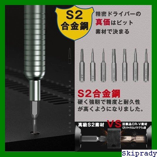 ◆◆【S2素材使用】最高級素材S2に変更したビットは耐久性がある 衝撃や振動にも強いです。S2材というS2鋼とも呼ばれ、炭素(C)、ケイ素(Si)、マンガン(Mn)、クロム(Cr)、モリブデン(MO)、バナジウム(V)を配合した合金鋼を使用しており、一般的なクロムバナジウム鋼(CR-V材)よりも強く硬いため、一定の強度が求められる精密ドライバーには最適な素材です。S2ビットが硬く強靭で耐久性が高い、先端まで綺麗に精密に作られています。