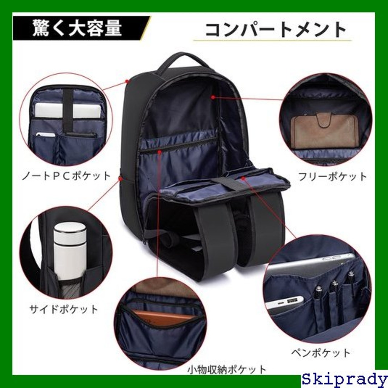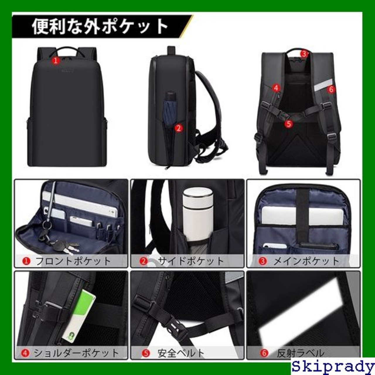 【素敵な細部のデザイン】◆盗難防止のため、背面にメインポケットが開くを設けます。◆フロントポッケトの左上に鍵などを取り付けられるバックルが付いています。鍵を探す手間が省けて時短に。◆メインルーム背面側にPC専用ポケットを配置し、移動中に滑るを防止のため、バンドがしっかり固定します。◆自立する構造の為、コンクリートなどで本体の生地を痛めないようにワイドサイズの叩き付けタイプゴム底を採用しています。劣化を防ぎ長く愛用できます。◆前後反射ラベル付き、夜間出行の時に、正面も背面も同時に安全を保つことができます。