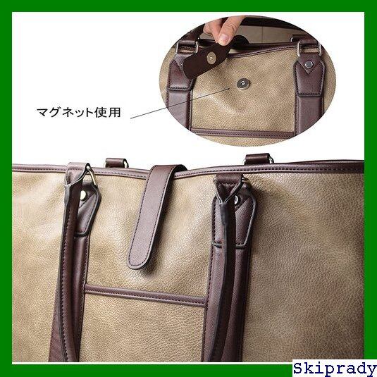 シンプルで、落ち着いたカラーがおしゃれなトートバッグ。 使い勝手の良いフェイクレザー(合成皮革)を使用した重厚感のあるしっかりとした作りで、カジュアルからビジネスにと幅広いスタイルにご活躍いただけます。 見た目よりも軽量で、持ち手も短すぎず肩にも掛けられるように長めに作られています。 バッグの中には、ファスナーポケット×1、フリーポケット×3、ペンポケット×1とポケットが複数あり便利です。 バッグ内には仕切りはございませんので、お好みに応じてお手持ちのバッグインバッグをご利用していただくことも可能です。 A4・B4サイズの書類、ペットボトル、スマホ、ポーチが入る大容量バッグですので、荷物の多い方にぴったりです。 用途:デイリースタイル/ビジネス(通勤)/通学/アウトドア(レジャー)/マザーズバッグ ギフトシーン:誕生日のお祝い/クリスマスプレゼント/バレンタイン/父の日/ 素材:合成皮革・ポリエステル(中生地) 重量:約860g サイズ:ヨコ約37cm(上部約49cm) タテ約35cm マチ約15cm 持ち手:約59cm(金具含まず)重量:約860g マグネット開閉式、オープンポケット×3、ペンポケット×2 ファスナーポケット×1